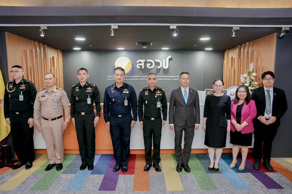 (7 ตุลาคม 2568) ดร.สุรชัย สถิตคุณารัตน์ ผู้อำนวยการสำนักงานสภานโยบายการอุดมศึกษา วิทยาศาสตร์ วิจัยและนวัตกรรมแห่งชาติ (สอวช.) และ ดร.สิริพร พิทยโสภณ รองผู้อำนวยการ สอวช. พร้อมด้วยผู้บริหารและพนักงาน สอวช. ให้การต้อนรับคณะผู้บริหารกรมวิทยาศาสตร์และเทคโนโลยีกลาโหม (วท.กห.) นำโดย พลโท คม วิริยเวชกุล เจ้ากรมวิทยาศาสตร์และเทคโนโลยีกลาโหม และพลอากาศตรี กิติศักดิ์ จุฑารัตน์ รองเจ้ากรมวิทยาศาสตร์และเทคโนโลยีกลาโหม เพื่อหารือแนวทางการขับเคลื่อนงานวิจัยและพัฒนาด้านความมั่นคงของประเทศ ณ ห้องประชุมหว้ากอ 2 อาคารจัตุรัสจามจุรี ชั้น 14 สอวช.