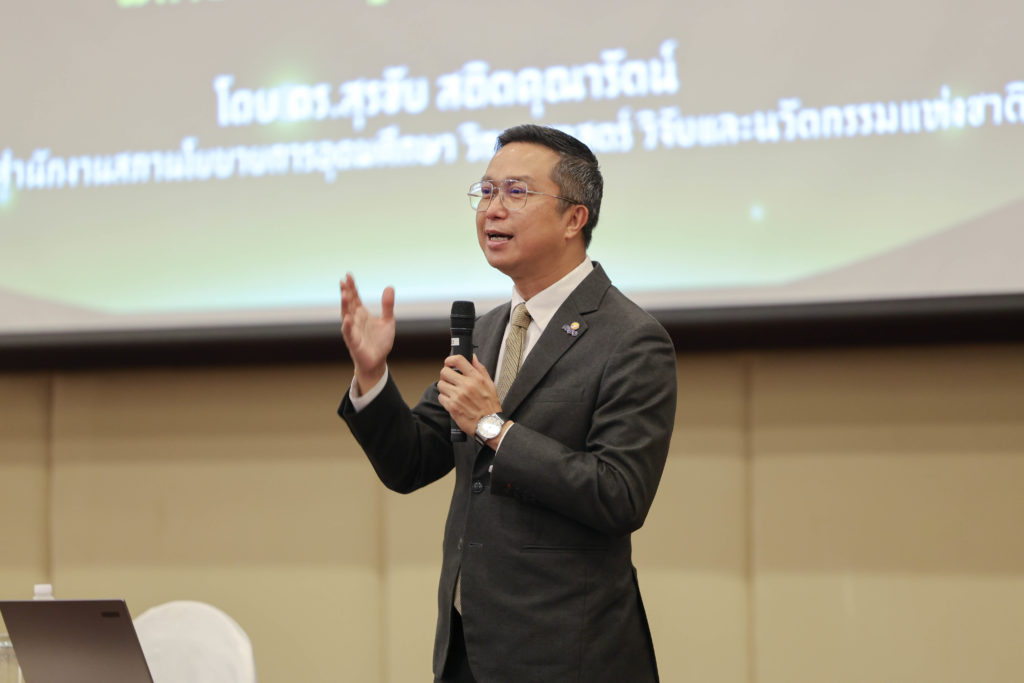 ดร.สุรชัย กล่าวถึงแนวทางการพัฒนาเศรษฐกิจโดยใช้การอุดมศึกษา วิทยาศาสตร์ วิจัย และนวัตกรรม (อววน.) ในระยะต่อไป ใน 5 แนวทาง ได้แก่ 1. กรอบนโยบายด้านอุดมศึกษา พบว่ามีช่องว่าง คือ 1. สัดส่วนการจ้างงานกำลังคนทักษะสูงในตลาดแรงงาน 2. การเปลี่ยนแปลงของเทคโนโลยี และ 3. ช่องว่างทักษะแรงงาน (Skill Gap) จึงต้องมีการศึกษาทิศทางความต้องการกำลังคน เพื่อรองรับการเปลี่ยนแปลงในอนาคต และความต้องการในบริบทเชิงพื้นที่และสังคม มีแนวทางจัดทำแผนและนำร่องกลไกการพัฒนากำลังคนทักษะสูงตามความต้องการของประเทศ รวมถึงจัดทำข้อเสนอการปรับบทบาทสถาบันอุดมศึกษา และระบบนิเวศการพัฒนากำลังคนทักษะสูง 2. กรอบนโยบายด้าน ววน. มีเป้าหมายหลักในการใช้ ววน. เพื่อการรับมือปัญหาสิ่งแวดล้อมและการเปลี่ยนแปลงสภาพภูมิอากาศได้อย่างยั่งยืน ววน.  กับการพัฒนาสังคม ชุมชน และพื้นที่ เพื่อสร้างสังคมปลอดภัย สงบสุข และเท่าเทียม และ ววน. เพื่อการเจริญเติบโตทางเศรษฐกิจที่มีความมั่นคง มั่งคั่ง 3. ตัวอย่างกรอบการพัฒนาอุตสาหกรรม: เซมิคอนดักเตอร์และอิเล็กทรอนิกส์ขั้นสูง พัฒนาอุตสาหกรรม Semiconductor และอิเล็กทรอนิกส์ขั้นสูง เพื่อก้าวสู่การเป็นผู้นำการผลิตในเอเชียตะวันออกเฉียงใต้ 4. การยกระดับ SMEs สู่ผู้ประกอบการธุรกิจฐานนวัตกรรม หรือ IDEs (Innovative Driven Enterprises) สนับสนุน SMEs เพิ่มการเข้าถึงเทคโนโลยี ยกระดับผลิตภาพการผลิต เพิ่มคุณภาพและต่อยอดนวัตกรรม และ 5. การพัฒนาเชิงพื้นที่และลดความเหลื่อมล้ำ มีเป้าหมายในการยกระดับมหาวิทยาลัยเป็นศูนย์กลางพัฒนาสังคมและเศรษฐกิจพื้นที่ ลดความเหลื่อมล้ำเชิงพื้นที่ สร้างโอกาสที่เป็นธรรม และเพิ่มการจ้างงานคุณภาพและเศรษฐกิจฐานความรู้ในภูมิภาค
