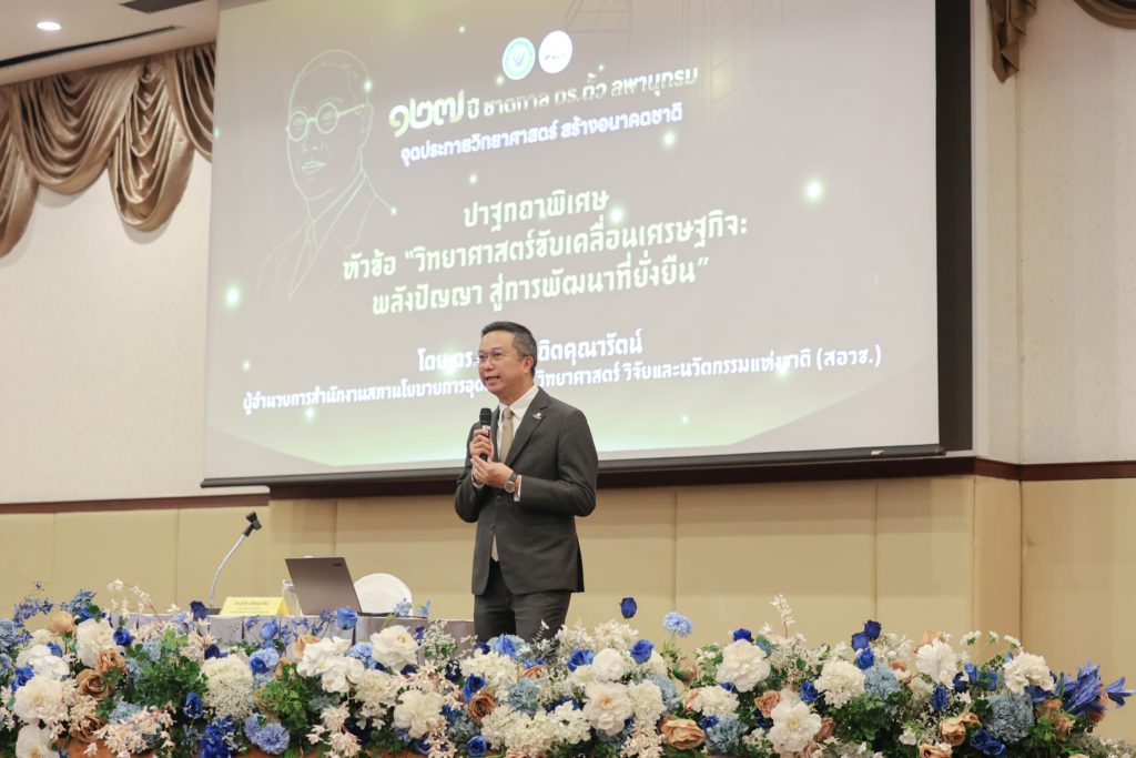 (21 ตุลาคม 2568) ดร.สุรชัย สถิตคุณารัตน์ ผู้อำนวยการสำนักงานสภานโยบาย การอุดมศึกษา วิทยาศาสตร์ วิจัย และนวัตกรรมแห่งชาติ (สอวช.) กล่าวปาฐกถาพิเศษในหัวข้อ “วิทยาศาสตร์ขับเคลื่อนเศรษฐกิจ : พลังปัญญา สู่การพัฒนาที่ยั่งยืน” ในงานสัมมนาเชิงวิชาการ “127 ปี ชาตกาล ดร.ตั้ว ลพานุกรม : จุดประกายวิทยาศาสตร์ สร้างอนาคตชาติ” จัดโดย มูลนิธิ ดร.ตั้ว ลพานุกรม ร่วมกับ กรมวิทยาศาสตร์บริการ (วศ.) ณ ห้องประชุมภูมิบดินทร์ ชั้น 6 อาคารสถาบันพัฒนานักวิทยาศาสตร์ กรมวิทยาศาสตร์บริการ
