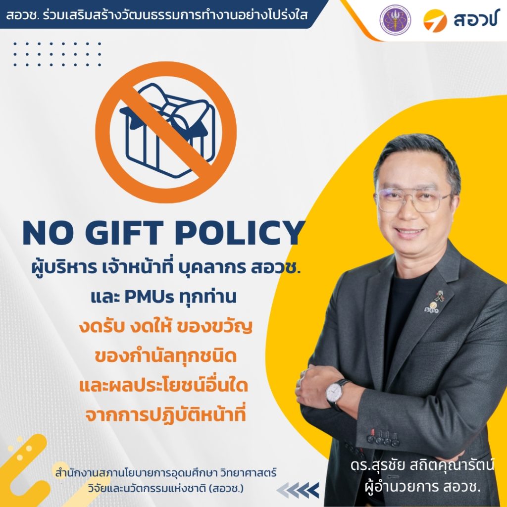 ผู้อำนวยการ สอวช. ได้ประกาศเจตนารมณ์อย่างเป็นทางการว่า ในปี 2569 สอวช. จะเป็นหน่วยงานที่ผู้บริหาร เจ้าหน้าที่ และบุคลากรทุกคน “งดรับ และงดให้ของขวัญหรือผลประโยชน์อื่นใด จากการปฏิบัติหน้าที่ในทุกโอกาส” เพื่อเป็นการป้องกันการเลือกปฏิบัติและป้องกันผลประโยชน์ทับซ้อนในทุกรูปแบบ โดยนโยบายนี้ครอบคลุมไปถึงบุคลากรของหน่วยบริหารและจัดการทุนด้วย เพื่อป้องกันการทุจริตและประพฤติมิชอบทั้งในปัจจุบันและอนาคต