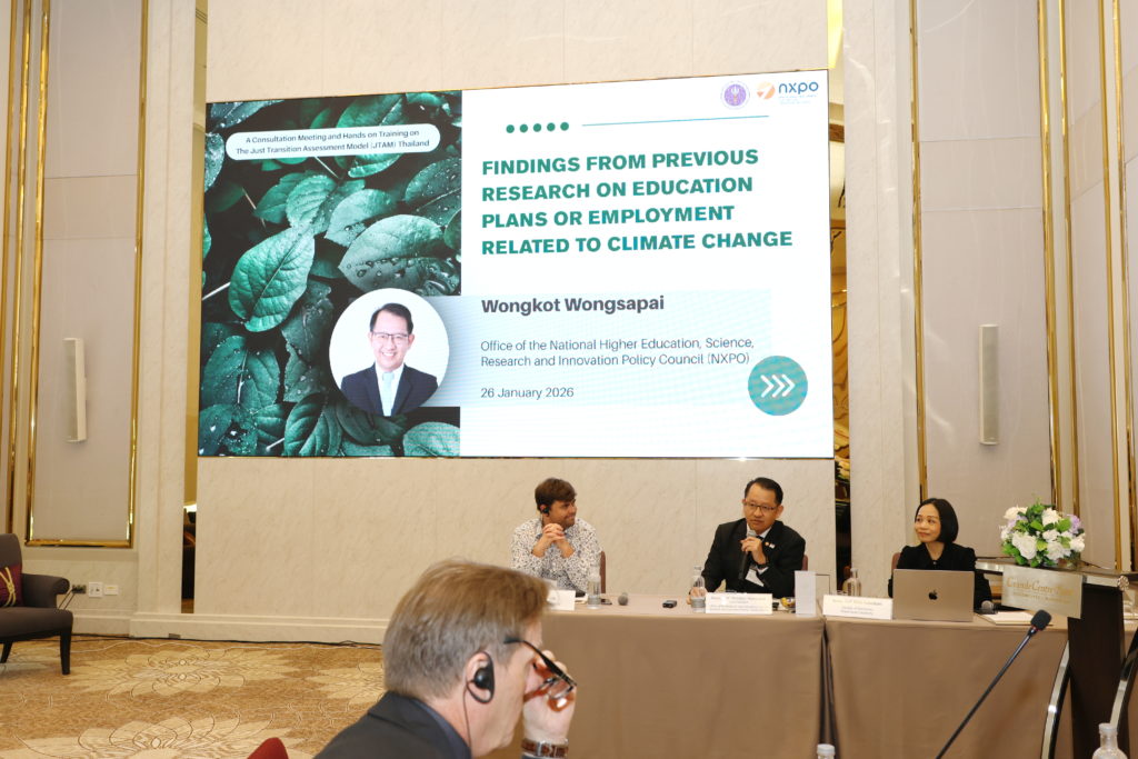 รศ.วงกต วงศ์อภัย รองผู้อำนวยการสำนักงานสภานโยบายการอุดมศึกษา วิทยาศาสตร์ วิจัยและนวัตกรรมแห่งชาติ (สอวช.) เข้าร่วมเป็นวิทยากรบรรยายในหัวข้อ “Findings from previous research on education plans or employment related to climate change” ในการประชุมปรึกษาหารือ Just Transition Assessment Model (JTAM) Thailand จัดโดย องค์การแรงงานระหว่างประเทศ (ILO) ร่วมกับสำนักงานสภาพัฒนาการเศรษฐกิจและสังคมแห่งชาติ และมหาวิทยาลัยธรรมศาสตร์ ภายใต้กรอบความร่วมมือ Partnership for Action on Green Economy (PAGE) ซึ่งเป็นความร่วมมือของ 5 องค์การสหประชาชาติ ได้แก่ ILO, UNDP, UNIDO, UNEP และ UNITAR ในวันที่ 26 มกราคม 2569 ณ โรงแรมแกรนด์ เซ็นเตอร์ พอยต์ เพลินจิต กรุงเทพมหานคร โดยมีผู้แทนจากหน่วยงานภาครัฐ ภาควิชาการ ภาคเอกชน และองค์กรระหว่างประเทศเข้าร่วมเป็นจำนวนมาก