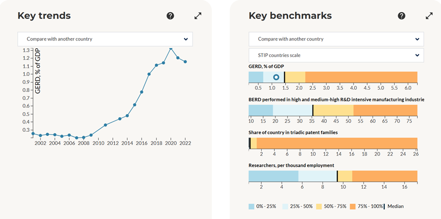 ภาพตัวอย่างการแสดงผลแบบกราฟฟิกของข้อมูล GERD (Gross Expenditure for R&D) ของประเทศไทยในหน้าเว็บ STIP Compass โดยเป็นกราฟแสดงแนวโน้มการเพิ่มขึ้นหรือลดลงเป็นรายปี (ภาพซ้าย) และแผนภูมิแสดงตำแหน่งของค่า GERD ของไทยในการสำรวจครั้งล่าสุดปี 2025 ซึ่งเท่ากับ 1.16% ของ GDP ประเทศไทย เทียบกับค่ามัธยฐานของ OECD ที่ประมาณ 1.5% ของ GDP ประเทศในกลุ่ม OECD