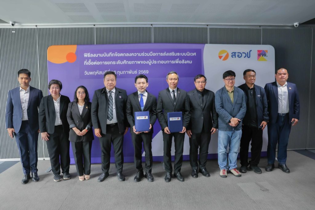 (26 กุมภาพันธ์ 2569) สำนักงานสภานโยบายการอุดมศึกษา วิทยาศาสตร์ วิจัยและนวัตกรรมแห่งชาติ (สอวช.) ภายใต้ กระทรวงการอุดมศึกษา วิทยาศาสตร์ วิจัยและนวัตกรรม (อว.) ร่วมกับสำนักงานส่งเสริมวิสาหกิจเพื่อสังคม (สวส.) ลงนามความร่วมมือเพื่อส่งเสริมระบบนิเวศที่เอื้อต่อการยกระดับศักยภาพของผู้ประกอบการเพื่อสังคม โดยมี ดร.สุรชัย สถิตคุณารัตน์ ผู้อำนวยการ สอวช. และ นายอัครพล ลีลาจินดามัย ผู้อำนวยการ สวส. เป็นผู้กล่าวต้อนรับและกล่าวเปิดงาน