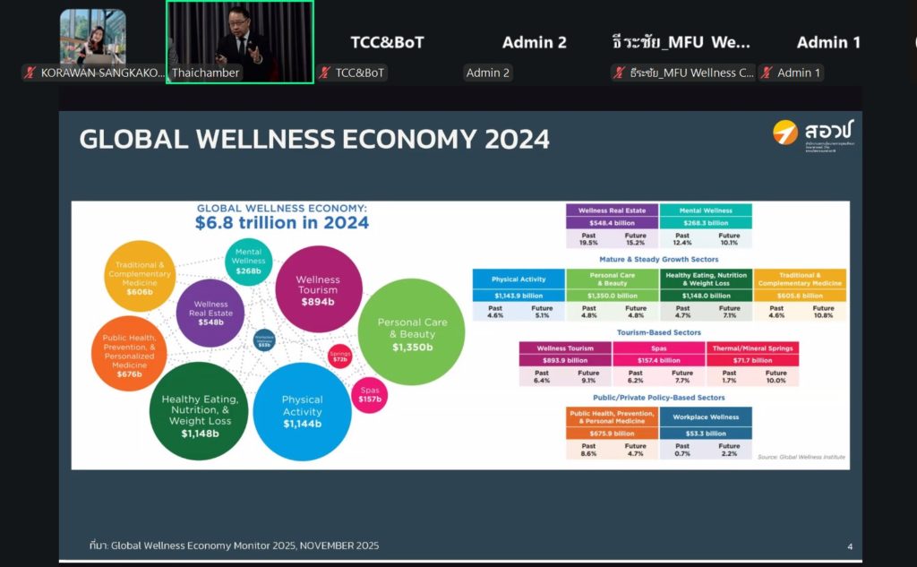 สำหรับศักยภาพของ Wellness ไทย มีมูลค่าตลาดกว่า 1.4 ล้านล้านบาท และมีอัตราการเติบโตกว่า 28.4% ซึ่งสูงกว่าค่าเฉลี่ยของโลก ซึ่งสะท้อนให้เห็นศักยภาพของไทยในการสร้างการเติบโตในกลุ่มอุตสาหกรรมนี้ โดย 3 กลุ่มเป้าหมายใหม่ของ Wellness ไทย ประกอบด้วย 1. Gen Z & Millennials ที่หันมาลงทุนด้านสุขภาพมากขึ้น และยังให้ความสำคัญกับสุขภาพจิตใจ ทั้งในชีวิตประจำวันและการทำงานที่ต้องมี Work-Life Balance 2. Silver Economy อยู่ในกลุ่มสังคมสูงอายุระดับสุดยอด (Super-Aged Society) มีศักยภาพในการใช้จ่าย คำนึงถึงการมีคุณภาพชีวิตที่ดีผ่านการได้รับบริการในระดับพรีเมียม และ 3. High-Quality Health Tourists เป็นการดึงดูดกลุ่มนักท่องเที่ยวคุณภาพสูงจากต่างประเทศ