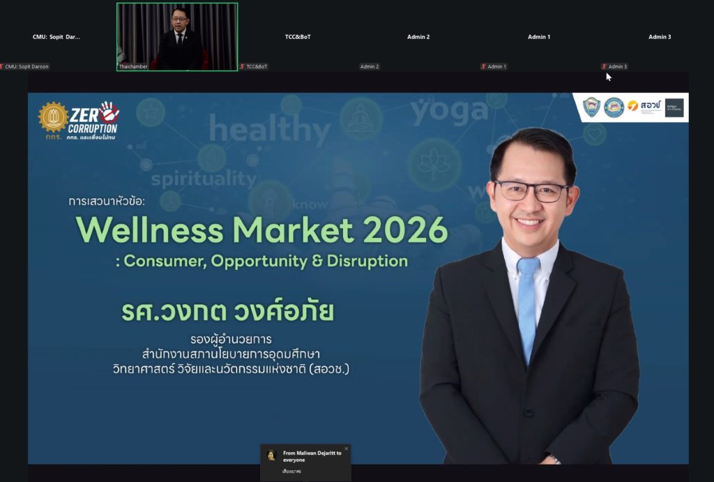 (6 มีนาคม 2569) สำนักงานสภานโยบายการอุดมศึกษา วิทยาศาสตร์ วิจัยและนวัตกรรมแห่งชาติ (สอวช.) ภายใต้ กระทรวงการอุดมศึกษา วิทยาศาสตร์ วิจัยและนวัตกรรม (อว.) ร่วมกับ คณะอนุกรรมการธุรกิจบริการเพื่อสุขภาพ หอการค้าไทย และ บริษัท โบลลิเกอร์ แอนด์ คอมพานี (ประเทศไทย) จำกัด จัดกิจกรรมเสวนา “Wellness Foresight 2026: แนวโน้มและกลยุทธ์ธุรกิจ” ณ ห้อง Activity Hall สภาหอการค้าแห่งประเทศไทย โดยมี รศ.วงกต วงศ์อภัย รองผู้อำนวยการ สอวช. เป็นหนึ่งในผู้ร่วมการเสวนา ร่วมกับ ดร.รัชดา เจียสกุล ประธานเจ้าหน้าที่บริหาร บริษัท โบลลิเกอร์ แอนด์ คอมพานี (ประเทศไทย) จำกัด กรรมการคณะอนุกรรมการธุรกิจบริการเพื่อสุขภาพ และดำเนินรายการโดย นายกรด โรจนเสถียร กรรมการสภาหอการค้าแห่งประเทศไทย ประธานคณะอนุกรรมการธุรกิจบริการเพื่อสุขภาพ