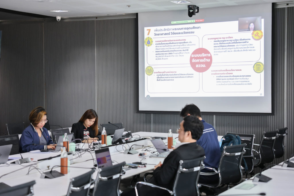 (25 มีนาคม 2569) สำนักงานสภานโยบายการอุดมศึกษา วิทยาศาสตร์ วิจัยและนวัตกรรมแห่งชาติ (สอวช.) นำโดย ดร.สุรชัย สถิตคุณารัตน์ ผู้อำนวยการ สอวช. ศ. ดร.สุรินทร์ คำฝอย รศ.วงกต วงศ์อภัย รองผู้อำนวยการ สอวช. ดร.สุชาต อุดมโสภกิจ ดร.กรัณฑรัตน์ นาขวา ผู้ช่วยผู้อำนวยการ สอวช. พร้อมด้วยตัวแทนบุคลากร สอวช. ร่วมนำเสนอแผนและผลการปฏิบัติงานของหน่วยงาน ในการตรวจเยี่ยมการปฏิบัติงานตามภารกิจของ สอวช. ตามแผนการตรวจราชการกระทรวงการอุดมศึกษา วิทยาศาสตร์ วิจัยและนวัตกรรม (อว.) ประจำปีงบประมาณ 2569 ณ ห้องประชุมหว้ากอ 1 สอวช. ชั้น 14 อาคารจัตุรัสจามจุรี และผ่านระบบออนไลน์
