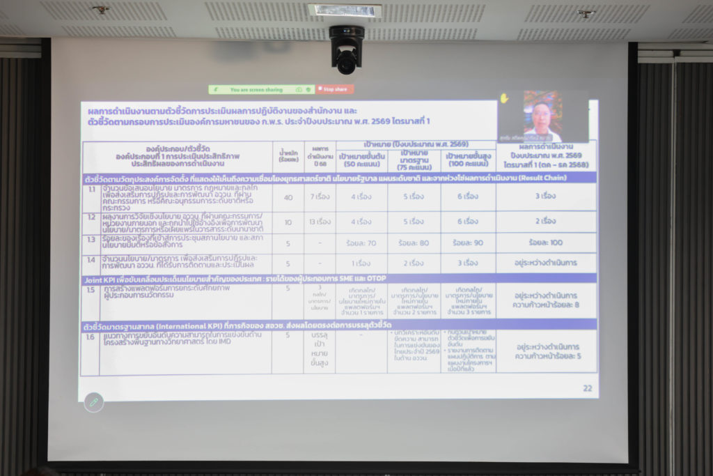 สอวช. ได้นำเสนอโครงสร้างหน่วยงาน วิสัยทัศน์ พันธกิจ และภารกิจตามกฎหมายการจัดตั้งหน่วยงาน พร้อมสรุปแผนและผลการดำเนินงานที่สำคัญ ประจำปีงบประมาณ 2568 และแผนการดำเนินงานของปีงบประมาณ 2569 โดยมีการดำเนินงานใน 5 เป้าหมายหลัก ได้แก่ 1. ยกระดับประเทศไทยให้พ้นจากกับดักรายได้ปานกลางด้วยการเพิ่มจำนวนบริษัทนวัตกรรม ผ่านแพลตฟอร์มยกระดับศักยภาพผู้ประกอบการ Scaleup สู่ตลาดในและต่างประเทศ และการเตรียมความพร้อมรองรับอุตสาหกรรมแห่งอนาคต (Future Industry) 2. ยกระดับเศรษฐกิจฐานรากและลดความเหลื่อมล้ำด้วยการอุดมศึกษา วิทยาศาสตร์ วิจัยและนวัตกรรม ผ่านนโยบายนวัตกรรมเพื่อเศรษฐกิจฐานราก 3. ลดก๊าซเรือนกระจก 10 ล้านตัน คาร์บอนไดออกไซด์เทียบเท่า ด้วยการพัฒนาระบบนิเวศส่งเสริมกลไก อววน. หนุน Net Zero GHG Emissions 4. เพิ่มสัดส่วนแรงงานทักษะสูง ผ่านการขับเคลื่อนแพลตฟอร์มพัฒนากำลังคนสมรรถนะสูงและการพลิกโฉมสถาบันอุดมศึกษา (University Transformation) 5. เพิ่มประสิทธิภาพระบบ อววน. มุ่งเน้นการปฏิรูประบบการกำหนดนโยบาย การจัดสรรงบประมาณ การปลดล็อกกฎหมาย กฎ ระเบียบ และการติดตามประเมินผลด้านการอุดมศึกษา วิทยาศาสตร์ วิจัยและนวัตกรรม