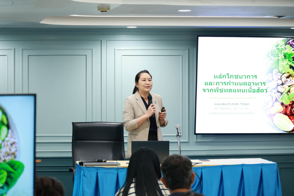 จากนั้นมีการบรรยายพิเศษในหัวข้อ “หลักโภชนาการและการกำหนดอาหารจากพืชทดแทนเนื้อสัตว์” โดย พันเอกหญิง ดร.กรกต วีรเธียร นายกสมาคมนักกำหนดอาหาร และการบรรยายในหัวข้อ “เวชศาสตร์วิถีชีวิต : อาหารที่อุดมด้วยพืชเพื่อสุขภาพอย่างยั่งยืน” โดย ดร. พญ.ไปรยาภัค สกุลวทัญญู อาจารย์แพทย์ ภาควิชาพยาธิวิทยาคลินิก คณะแพทยศาสตร์วชิรพยาบาล