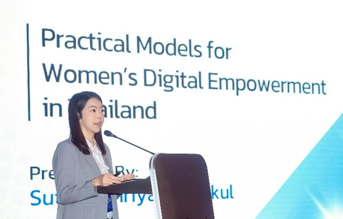 ขณะที่ นางสาวสุธิดา พิริยะการสกุล ผู้เชี่ยวชาญนโยบายอาวุโส ฝ่ายนวัตกรรมอุดมศึกษาและการพัฒนาทักษะแห่งอนาคต สอวช. ได้นำเสนอภาพรวมการขับเคลื่อนนโยบายดิจิทัลของประเทศไทยภายใต้ Thailand 4.0 ที่มุ่งพัฒนาโครงสร้างพื้นฐานและกำลังคนดิจิทัล ควบคู่กับการสร้างความเชื่อมั่นในการใช้เทคโนโลยี พร้อมสะท้อนสถานการณ์การเข้าถึงเทคโนโลยีของสตรีไทยที่อยู่ในระดับสูง แต่ยังเผชิญข้อจำกัดด้านโอกาสในอาชีพและรายได้ โดยเน้นย้ำความท้าทายเชิงโครงสร้าง อาทิ ข้อจำกัดในการเข้าถึงทรัพยากร ซึ่งทำให้ทักษะดิจิทัลยังไม่สามารถต่อยอดสู่ผลลัพธ์ทางเศรษฐกิจได้อย่างเต็มศักยภาพ ทั้งนี้ ได้เสนอแนวทางการพัฒนาที่มุ่งเชื่อมโยงทักษะสู่การสร้างอาชีพและรายได้ ผ่านการฝึกอบรมเชิงปฏิบัติ การส่งเสริมผู้ประกอบการสตรี และการออกแบบมาตรการเชิงนโยบายที่ตอบโจทย์ความต้องการในระดับพื้นที่