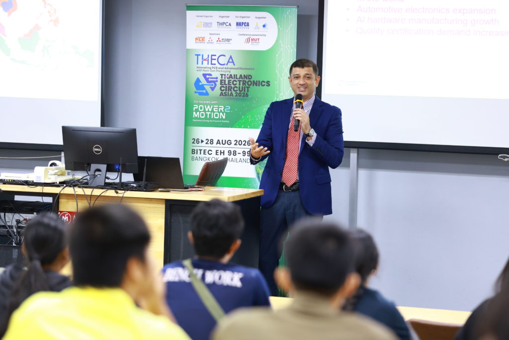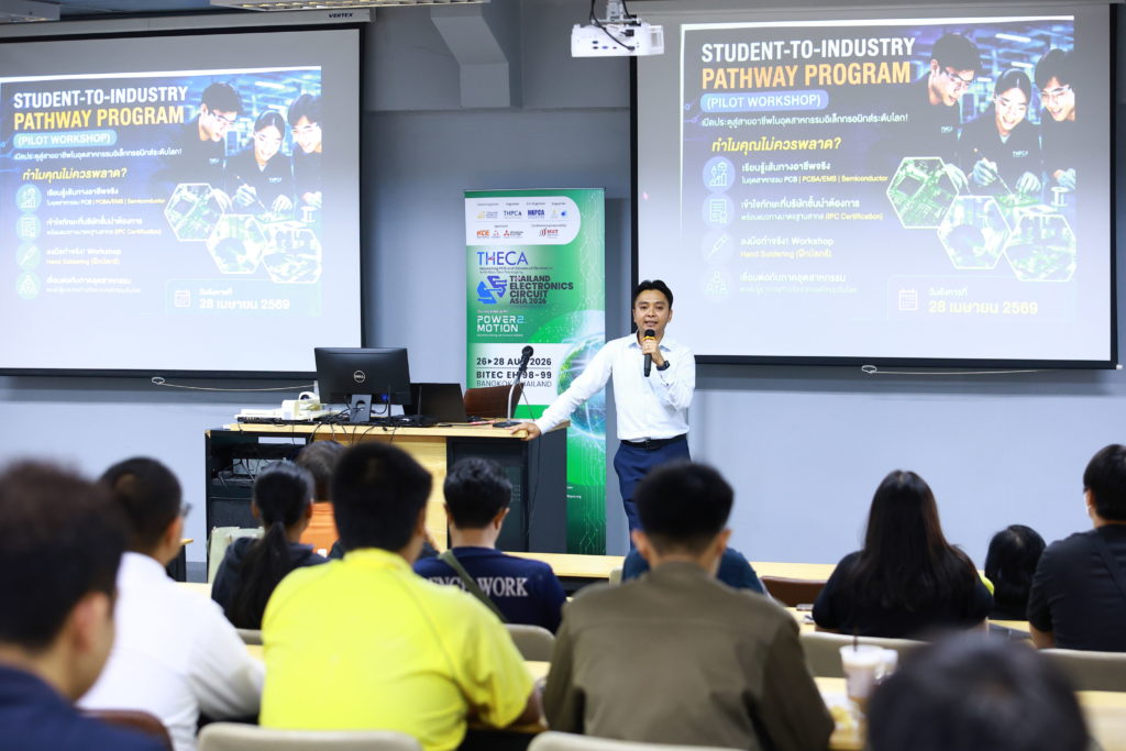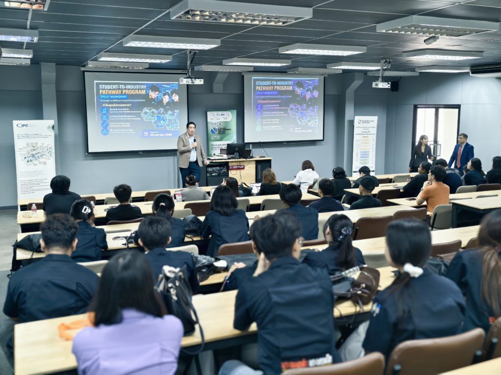 สำหรับโครงการ Student-to-Industry Pathway Program (Pilot Workshop) ครั้งนี้ มีเป้าหมายเพื่อถ่ายทอดองค์ความรู้ด้านอุตสาหกรรมอิเล็กทรอนิกส์ขั้นสูง ครอบคลุมอุตสาหกรรม PCB, PCBA/EMS และ Semiconductor ให้แก่นักศึกษา สร้างความเข้าใจเส้นทางอาชีพตามมาตรฐานสากล เช่น IPC Training & Certification ส่งเสริมการเรียนรู้เชิงปฏิบัติและการฝึกงาน ตลอดจนวางรากฐานความร่วมมือระหว่างองค์กรระดับสากล ภาคอุตสาหกรรม และสถาบันการศึกษา