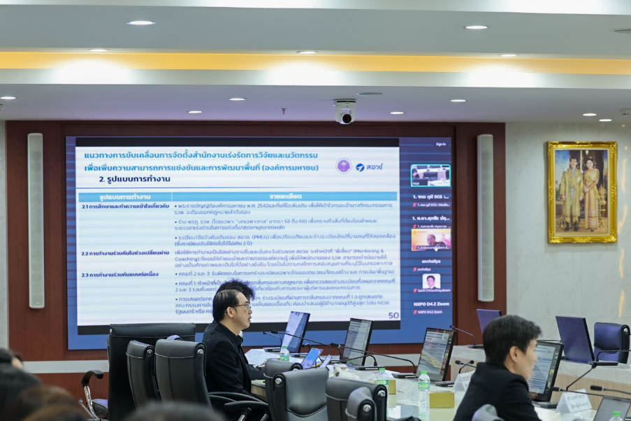 Ms. Ratima Urthamapimuk, Senior Strategist at NXPO, briefed the meeting on the organizational structure of the new office, which consists of four main administrative components: (1) a Board responsible for setting organizational policy, (2) an Executive Director, (3) program management units, and (4) subcommittees and directors of the three units transferred from NXPO along with their existing mandates. The implementation plan is scheduled over a 180-day period.