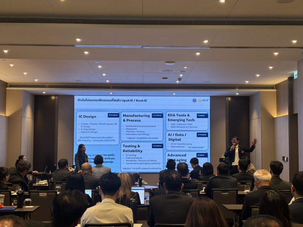 The session concluded with brainstorming session, withrepresentatives from THSIA and leading companies, including Analog Devices (Thailand), Silicon Craft Technology, Infineon Technologies Manufacturing (Thailand), NXP Semiconductors (Thailand), UTAC Thai, and Stars Microelectronics (Thailand). Representatives from the Thai Microelectronics Center (TMEC) and faculty members from 15 universities also actively contributed to the discussion.